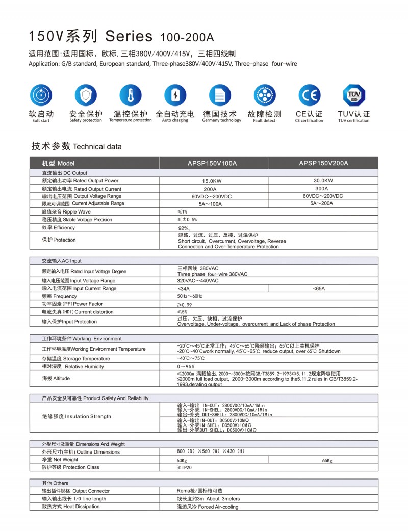 觸摸屏智能操作設計:告別傳統按鍵方式,給您帶來更現代更具科技智能的操作體驗 自動充電:插槍自動充電,簡化充電流程,便于操作 兼容性高:80V200A兼容48V200A充電 多重保護: 輸出短路,過流過壓保護,反接保護,電流導管保護等多重保護 預約充電功能:避開高峰用電時段,有效節省成本 雙語切換:中英文雙語隨需切換,跨越語言障礙,與世界接軌 人性化設計:充電機背板內部附部件明細及產品接線圖,方便客戶可更清楚的了解產品,便于維修,提高售后時效 獨特設計: 內置電磁鎖驅動模塊,防止臨時斷電鎖槍 使用壽命更長:功率模塊預留20%空間,提高模塊的使用壽命 出色內部結構: 內部結構左右出風,內部電路不容易積粉塵,提高充電機壽命