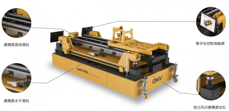 OMV飛機引擎安裝設備利用麥克納姆輪實現零回轉半徑、側移、全方位無死角任意漂移,具有獨立四點舉升裝置,結合自助導航、激光二次定位、導軌精密調節、控制發動機的移動、視覺精密定位完成六自由度精密裝配。