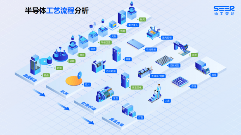 上圖為半導體整個工藝流程,圖表中清晰標注了仙工智能在整個半導體生產制程中能做的工作,包括清洗、光刻、離子注入、封測整個環(huán)節(jié)、除高溫固化和光檢以外的封測后段環(huán)節(jié)、成品倉儲整個環(huán)節(jié),上述環(huán)節(jié)均使用仙工智能自有的解決方案。