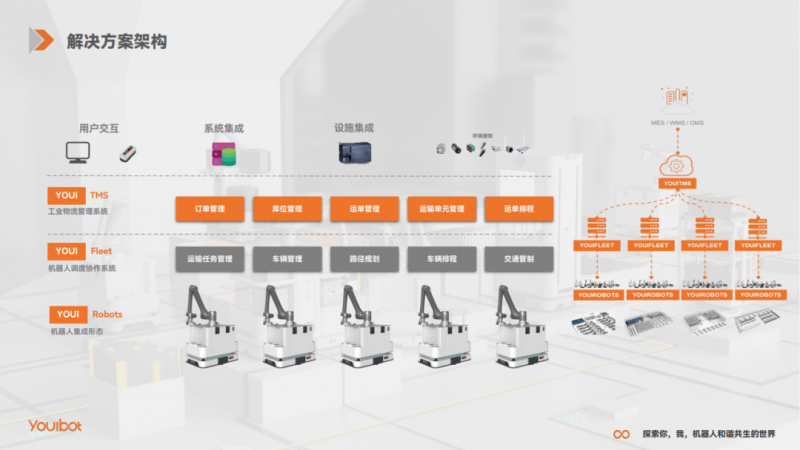 在移動(dòng)機(jī)器人基礎(chǔ)上,優(yōu)艾智合智慧物流管理系統(tǒng)YOUI TMS與企業(yè)MES、WMS等信息化系統(tǒng)對(duì)接,100%追蹤回溯每一件物料信息,完成物料從備料倉(cāng)到產(chǎn)線再到成品倉(cāng)的完整閉環(huán),在提質(zhì)增效的基礎(chǔ)上幫助企業(yè)實(shí)行柔性生產(chǎn)與數(shù)字化管理。