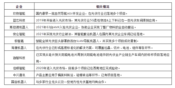 整體來看,當前光伏行業的AGV/AMR應用還處于前期的階段,整體需求還未完全釋放,競爭相對較低,但伴隨著光伏行業近兩年投資擴產風潮的盛行,以及光伏企業對AGV/AMR產品認知度的不斷提高,光伏行業對AGV/AMR需求也在逐步放量。當前,光伏行業已經成為AGV/AMR企業重點布局領域之一。
