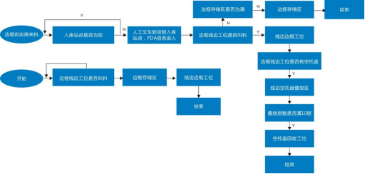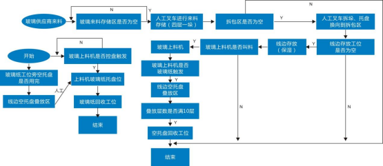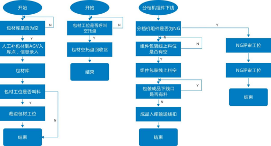 玻璃原片上料—EVA裁切鋪設—自動上模板—自動串焊—自動擺串—上背玻—EL測試單元—緩存堆棧—混進定位單元—層壓機—混出定位單元—自動修邊—翻轉檢查單元—自動裝框—上料機—固化—清洗--下料機—絕緣耐壓測試—IV測試單元—自動分檔—自動包裝—自動出入庫等。組件生產AGV自動小車自動按需運輸流程大致流程如下: