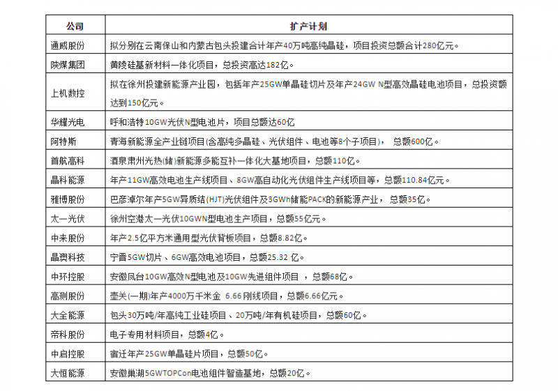 圖表:2022下半年光伏行業投資擴產項目(不完全統計)