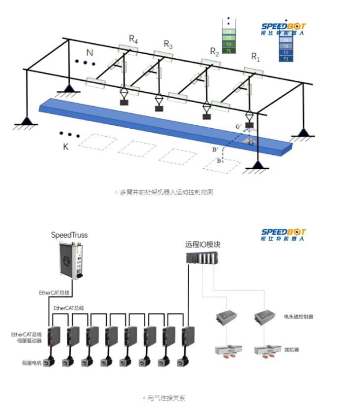 SpeedTruss智能桁架控制器主要用于多臂共軸桁架機器人(N≥1)的運動控制,運用自主研發的桁架運動規劃、多臂協同運動控制、無碰運動協調等算法技術,為智能產線提供靈活、精準、高效的多臂桁架運動控制方案。用戶只需調用控制器提供的高級任務指令接口(如將某臺桁架臂移動到目標位置K),即可實現對桁架機器人運動軌跡的自動控制與協調,保障各個桁架臂高效無碰協同運動,有效提升生產效率。