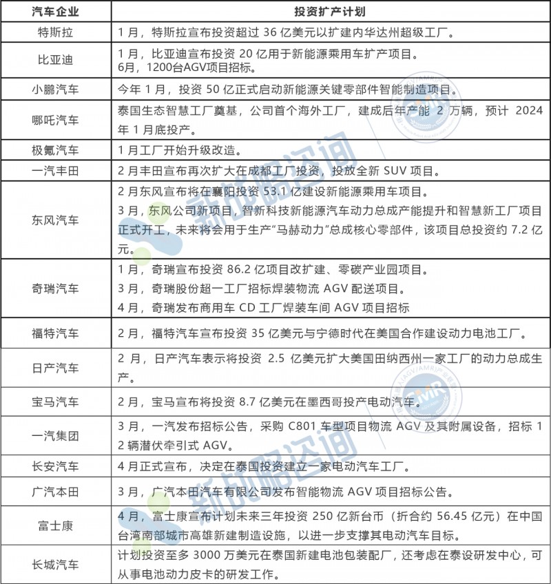 2023上半年汽車行業投資擴產及AGV項目招標情況分析