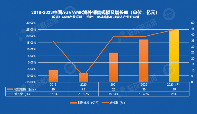 根據新戰略移動機器人產業研究所初步統計,2023年,中國AGV/AMR出口規模預計在45億左右。