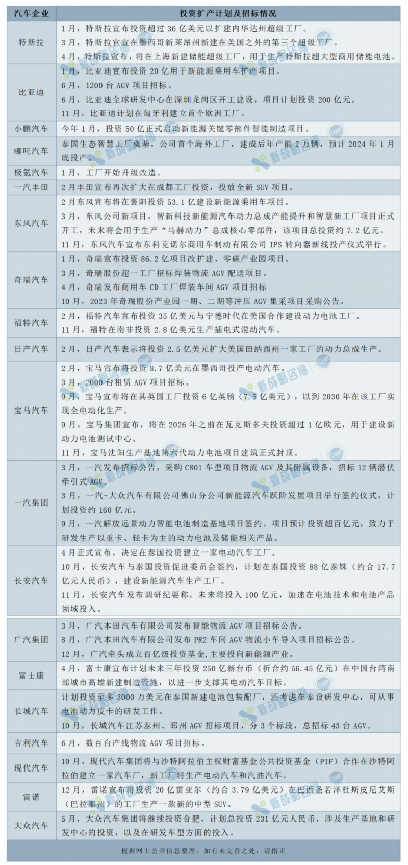 2023年前11月中國汽車銷量(數(shù)據(jù)來源:中國汽車工業(yè)協(xié)會)市場回暖,2023年,不少車企都宣布了投資擴產(chǎn)計劃,從下表中可以看出,加碼新能源、擴大全球布局成為行業(yè)內(nèi)的兩大趨勢。國內(nèi)的新能源車企開始逐步的走向海外,在外投資建廠,而傳統(tǒng)車企為了布局新能源業(yè)務,也在積極擴建新能源產(chǎn)線。