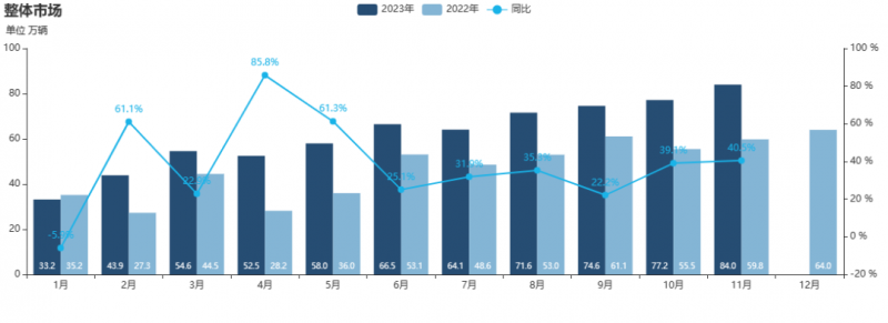 據(jù)中國汽車工業(yè)協(xié)會統(tǒng)計,1-11月,汽車產(chǎn)銷累計完成2711.1萬輛和2693.8萬輛,同比分別增長10%和10.8%,增速較1-10月分別提升2和1.7個百分點。至此,2023年前11個月,汽車產(chǎn)銷量已超過2022年全年(2022年我國汽車產(chǎn)銷分別為2702.1萬輛和2686.4萬輛)。預測2023年中國汽車銷量或接近3000萬輛,同比增長可能超過10%,超過2017年的2888萬輛創(chuàng)歷史新高。