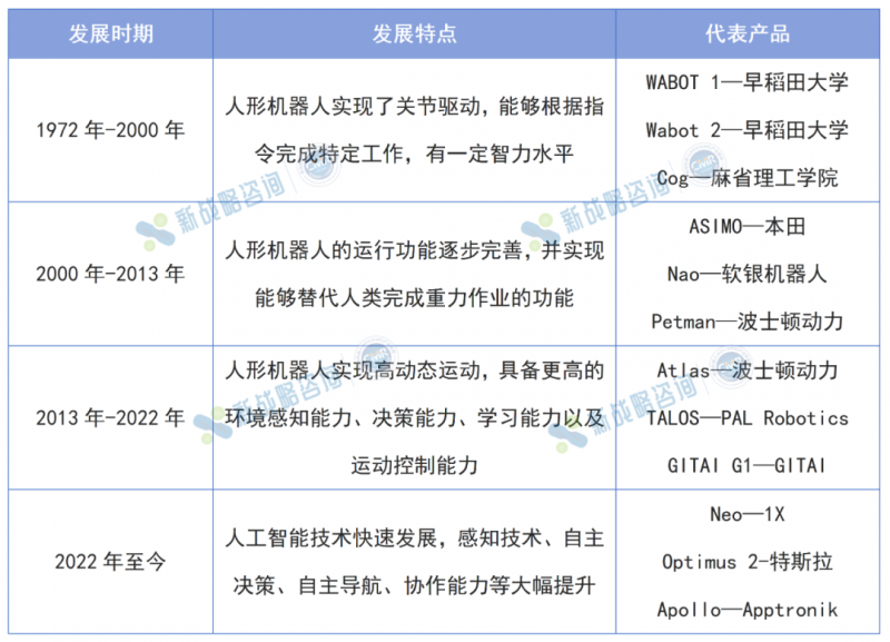 國外人形機器人技術的研發可追溯于1960年代后期。1967年,日本早稻田大學啟動了人形機器人相關項目,并于1972年研發出世界上第一款全尺寸人形智能機器人WABOT-1。WABOT-1可以實現緩慢行走,并具備簡單的對話能力。后來,隨著全世界科研人員在研究方向上的不斷創新,特別是進入 1990 年代后,人形機器人在控制方法和人工智能等方面的研究成果不斷出現,從而推動了人形機器人的快速發展。2000年,本田公司推出了ASIMO,這款機器人可以完成跳舞、上下樓梯等較為復雜的動作,標志著人形機器人的運行功能逐步完善,并實現能夠替代人類完成重力作業的功能。