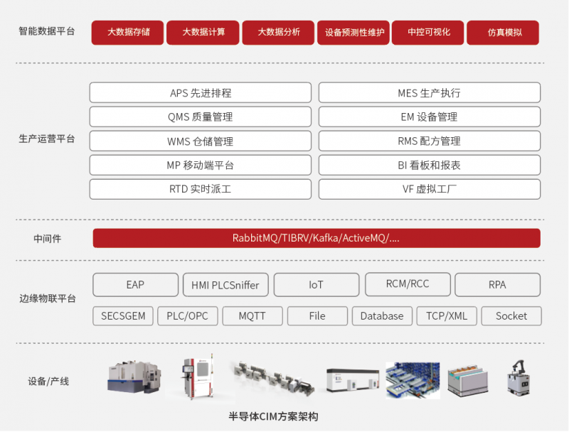 自主可控CIM系統(tǒng)方案,融合了在半導(dǎo)體晶圓和封測(cè)領(lǐng)域多年的專家經(jīng)驗(yàn),采用了最新一代的信息系統(tǒng)技術(shù)和平臺(tái),可滿足全自動(dòng)化和半自動(dòng)化場(chǎng)景需求的半導(dǎo)體數(shù)字化工廠解決方案。