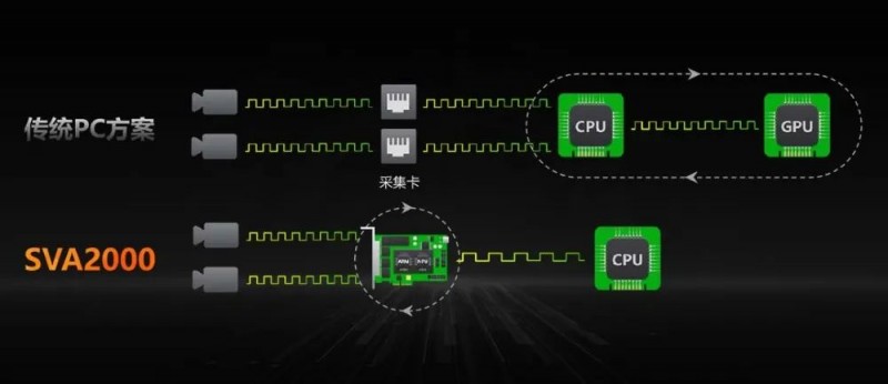 數(shù)據(jù)流無(wú)需經(jīng)過(guò)CPU,在SVA2000上即可完成全部視覺(jué)功能,CPU只在有需要時(shí)做少量的控制功能,大大降低了CPU負(fù)載,在某些應(yīng)用中甚至不需要CPU參與工作。