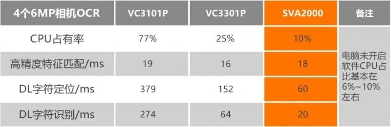 SVA2000利用硬件平臺(tái)的異構(gòu)特性對(duì)軟件架構(gòu)和算法效率進(jìn)行了深度優(yōu)化,在4相機(jī)應(yīng)用場(chǎng)景下,它的性能可以對(duì)齊桌面級(jí)CPU和GPU,能夠滿足大部分多相機(jī)視覺(jué)應(yīng)用的節(jié)拍要求。