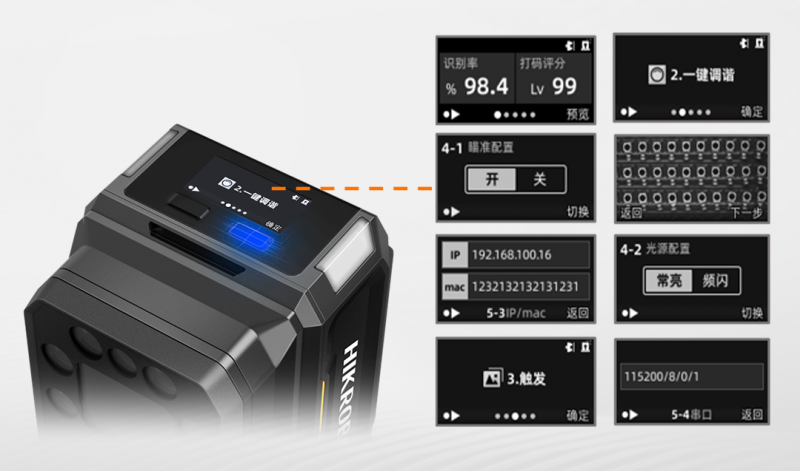 新增OLED顯示屏,通過與按鍵聯(lián)動(dòng),無需PC即可實(shí)現(xiàn)確認(rèn)主機(jī)信息、讀碼狀態(tài)實(shí)時(shí)查看、讀碼器參數(shù)輕松設(shè)定和快速復(fù)制等功能。