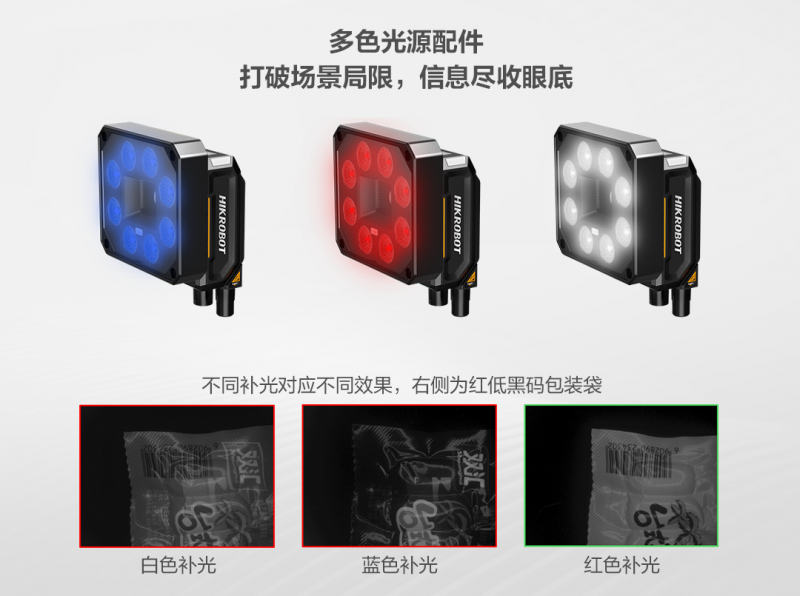 除常見的鏡頭罩及多色補(bǔ)光外,還支持?jǐn)U展高亮光源、多色光源以及行業(yè)專用光源等,場景適應(yīng)能力更強(qiáng)。