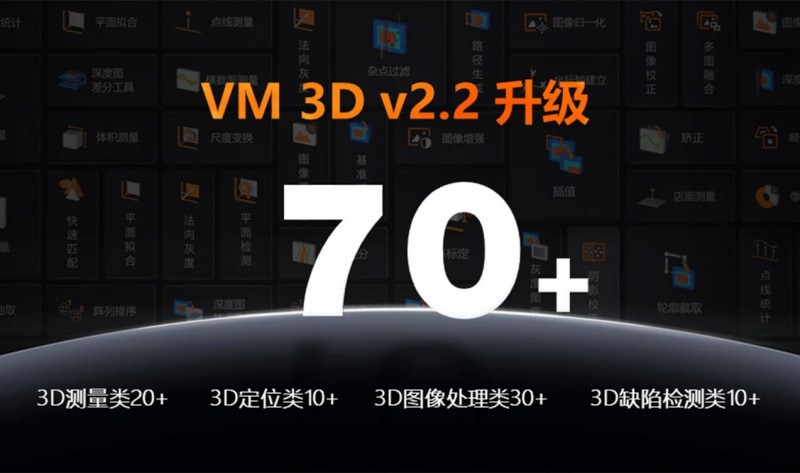 VM 3D算法平臺迎來V2.2版本的重大升級!新版本3D算子陣容實現全面升級,功能更加強大,從原有的50個躍升至70+,全面覆蓋3D測量、定位、圖像處理及缺陷檢測等關鍵模塊,為用戶提供更加強大且全面的基礎功能支持。此次更新進一步增強了算法平臺的性能與靈活性,面對復雜3D視覺應用更加得心應手。