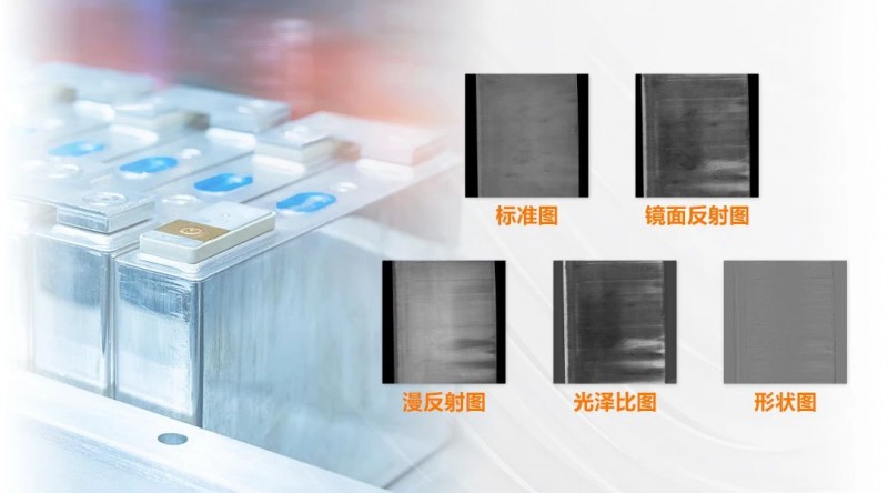 海康機器人高速線陣2.5D成像系統能完美適配鋰電生產的高速場景,同時消除電池鋁殼、覆膜和金屬蓋板高反光和背景顏色對缺陷的干擾,在復雜樣品表面特征中準確抓住凹凸缺陷,配合多種結果圖對缺陷進行區分。