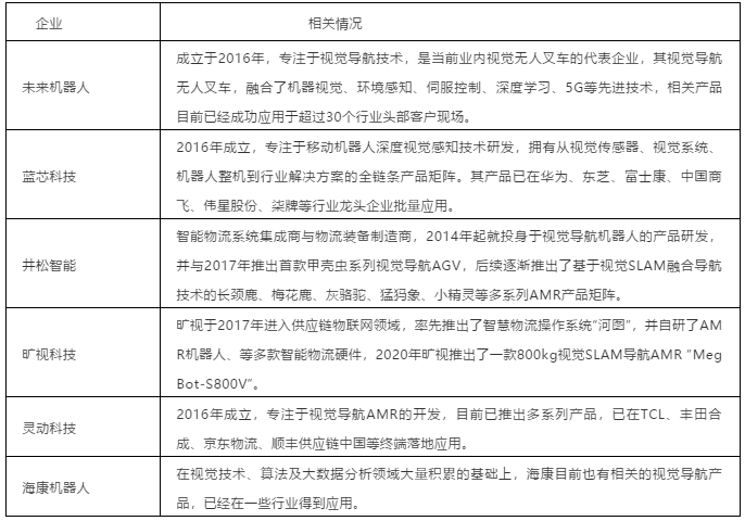 圖表:國(guó)內(nèi)主流視覺導(dǎo)航AGV/AMR廠商(本表粗略統(tǒng)計(jì),如有未完善之處,請(qǐng)指正?。?