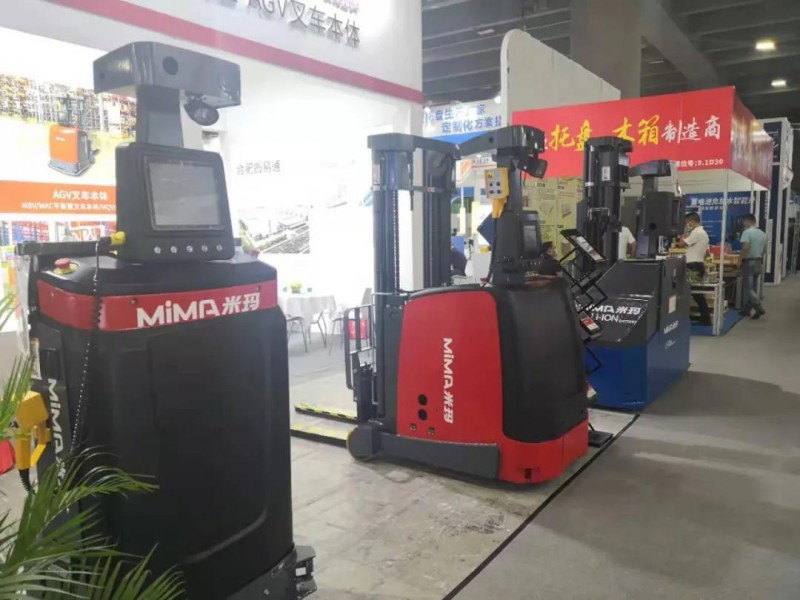 搬易通此次展示了三款A(yù)GV專用車體——SLIM超窄通道堆垛車、室內(nèi)平衡重堆垛車及全向叉車。