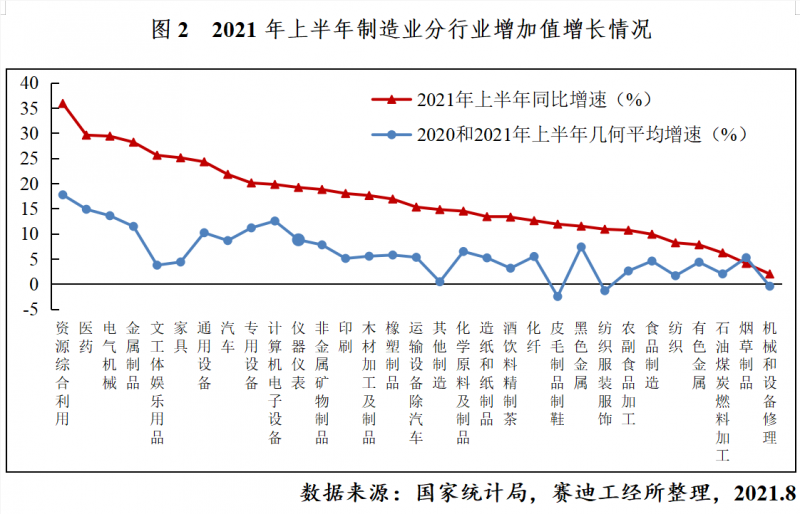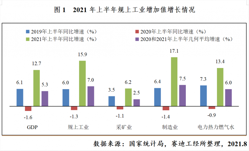 從整體看,2021年上半年工業(yè)生產(chǎn)呈恢復(fù)性增長(zhǎng)態(tài)勢(shì)。上半年,工業(yè)增加值同比增長(zhǎng)15.9%,增速較上年同期加快17.2個(gè)百分點(diǎn);兩年平均增長(zhǎng)7.0%,平均增速較2019年同期加快1個(gè)百分點(diǎn),達(dá)2015年以來(lái)同期最高水平。