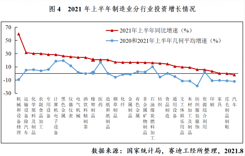 The investment structure was further optimized driven by high-tech manufacturing. In the first half of the year, the investment in high-tech manufacturing industry increased by 29.7% year-on-year and 17.1% on average in two years. The average growth rate significantly exceeded the average level of manufacturing industry by 15.1 percentage points and increased by 6.7 percentage points compared with the same period in 2019. Among them, the investment in aerospace and equipment, computer and office equipment, medical equipment and instruments, electronic and communication equipment manufacturing increased by 56.4%, 47.5%, 34.2% and 29.9% respectively in the first half of the year.