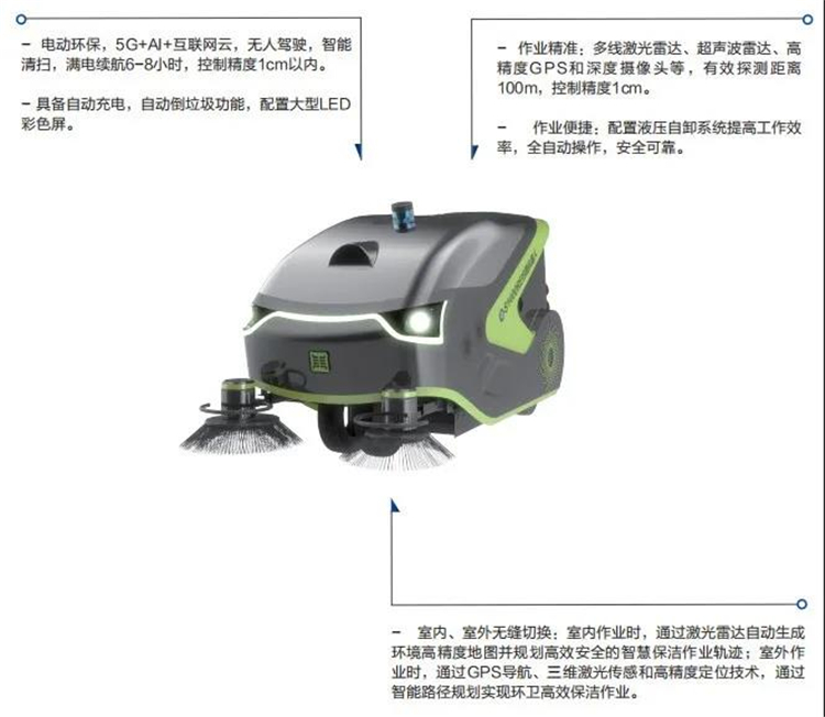 這款產(chǎn)品采用國(guó)內(nèi)先進(jìn)的無(wú)人駕駛控制技術(shù),“互聯(lián)網(wǎng)云+機(jī)器人”智慧遠(yuǎn)程集群物聯(lián)互聯(lián)模式可大幅度提升環(huán)境環(huán)衛(wèi)行業(yè)的智能化水平和作業(yè)效率,杜絕環(huán)衛(wèi)人工作業(yè)的安全隱患及安全事故發(fā)生,大幅節(jié)省環(huán)境環(huán)衛(wèi)人力成本,經(jīng)濟(jì)社會(huì)效益顯著、應(yīng)用前景廣闊。主要適用于廣場(chǎng)、公園、產(chǎn)業(yè)園區(qū)、學(xué)校、機(jī)場(chǎng)、高鐵等眾多場(chǎng)所區(qū)域的清掃保潔作業(yè)。